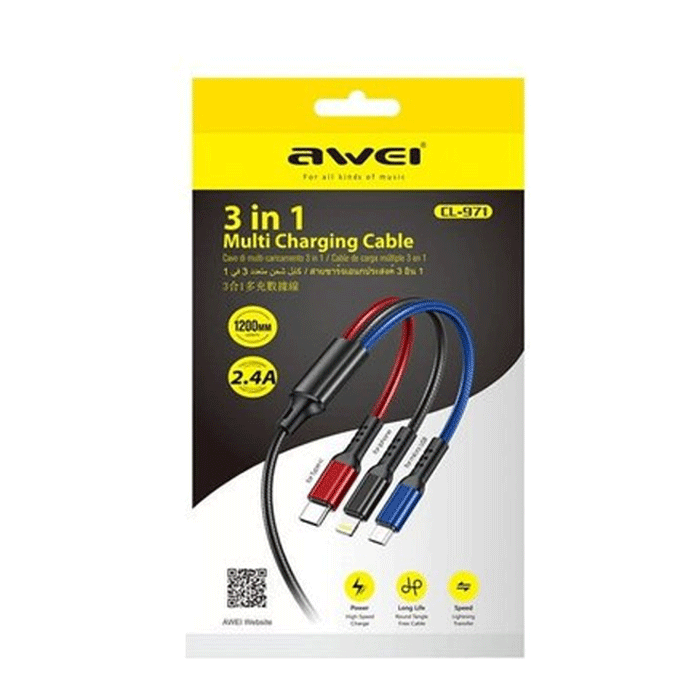 / AWEI CL-971 Καλώδιο Φόρτισης και Μεταφοράς Δεδομένων DATA CABLE 1.2M Braided USB Σε micro USB / Type-C / Lightning Cable 2.4A – Χρώμα: Μάυρο