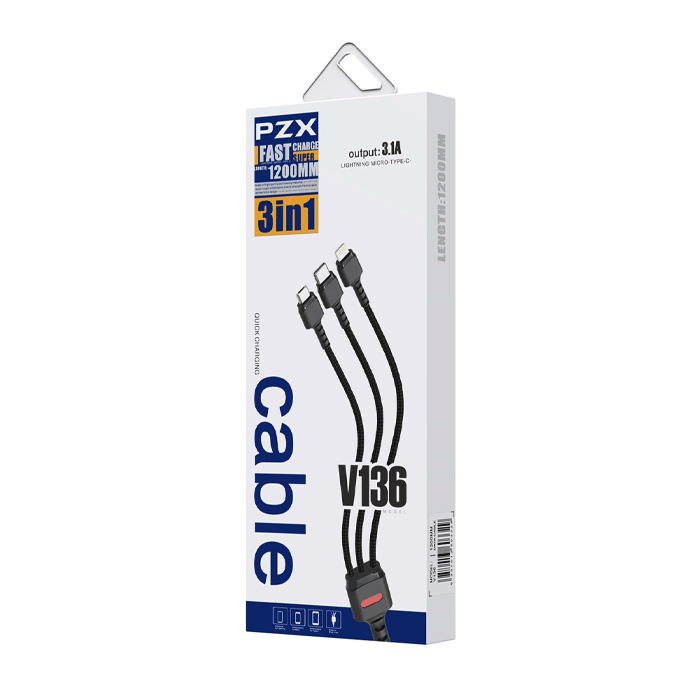 PZX V136 Καλώδιο Φόρτισης και Μεταφοράς Δεδομένων 1.2M / Charging And DATA CABLE 3 ΣΕ 1 USB ΣΕ Lightning / Type-C / micro USB 3.1A – Χρώμα: Μαύρο